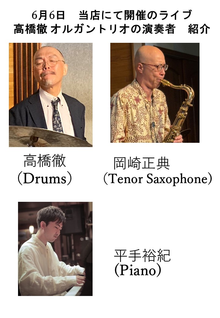 橋徹(drums):リーダーアルバム「TOKYO GROOVIN`HIGH」にて池田篤氏(alto sax)、吉田桂一氏(piano)、中村健吾氏(bass)、春風亭昇太師匠(trombone)、三遊亭小遊三師匠(trumpet)と共演、毎年8月上旬に浅草演芸ホールの特別公演の大喜利にて小遊三師匠のリーダーバンド「にゅう おいらんず」のドラマー。
