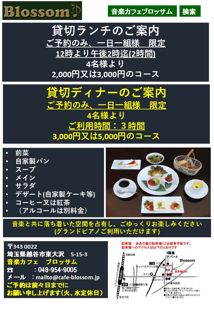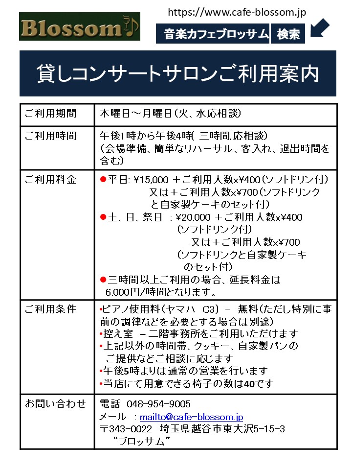 音楽カフェ Blossom は、埼玉県越谷市にある音楽を心地よく楽しむために作られたジャズ喫茶、名曲喫茶、レストラン・レンタルスペースで、防音完備の木の響きの空間にグランドピアノ(ヤマハC-3),最高級オーディオ装置を備えています。 お茶、食事、お酒を楽しみながら気軽にご利用下さい。小規模演奏会場(30席・控室完備)としての利用も可能です。