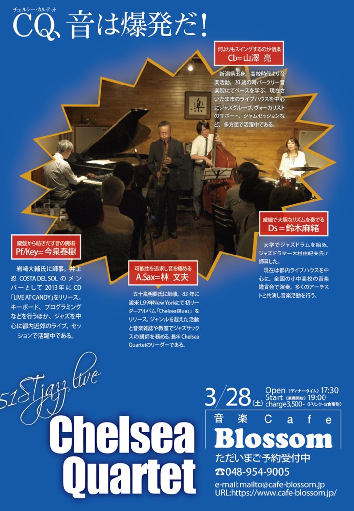 次回、第51回 CHELSEA QUARTET ライブは 2026年3月28日(土)に開催の予定です。 詳細決まりましたら掲示します。 次回も、皆様のご来場おまちしています。
