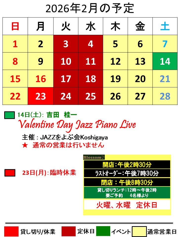 9月12日(土)、9月26日(土)、10月31日(土)にライブを予定しております。現在ご予約受付中です。詳細は当ホームページに記載のとおりです。宜しくお願い申し上げます。