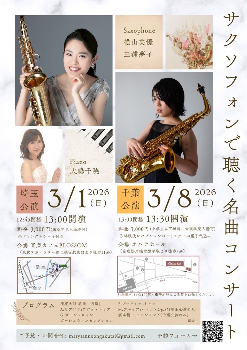 3月1日(日)サクソフォンで聴く名曲コンサート開催します