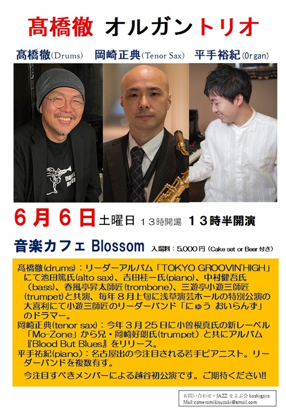 橋徹(drums):リーダーアルバム「TOKYO GROOVIN`HIGH」にて池田篤氏(alto sax)、吉田桂一氏(piano)、中村健吾氏(bass)、春風亭昇太師匠(trombone)、三遊亭小遊三師匠(trumpet)と共演、毎年8月上旬に浅草演芸ホールの特別公演の大喜利にて小遊三師匠のリーダーバンド「にゅう おいらんず」のドラマー。